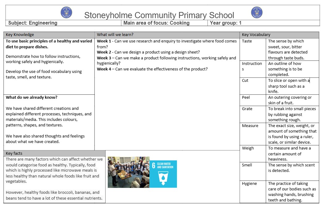 As engineers, we will be developing basic principles of a healthy and varied diet to prepare dishes. We will be learning about good hygiene practices and working safely, whilst using the Cooking Pot.