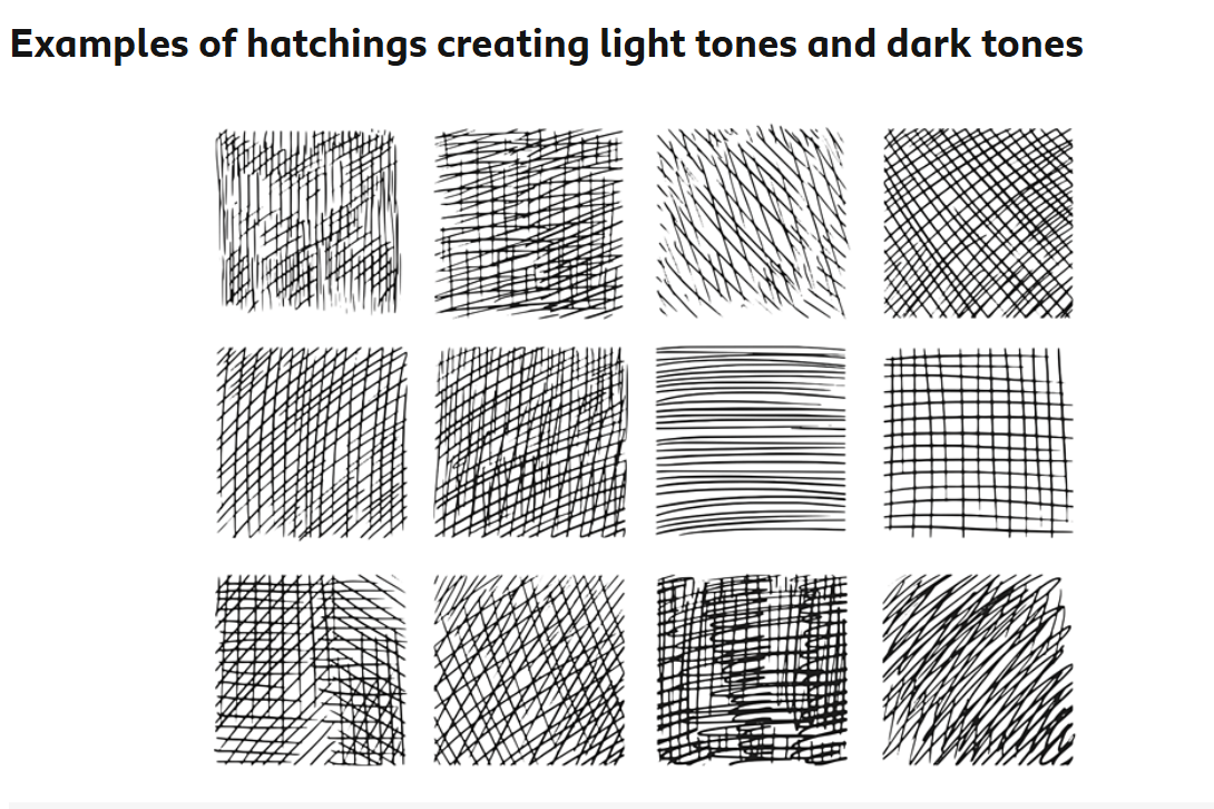 In hatching, the lines go in one direction. In cross-hatching, the lines cross over the top of each other.