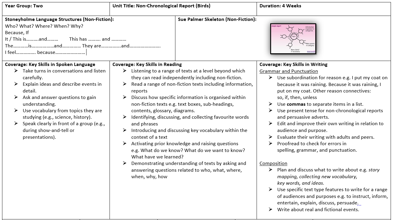 This half term, the children will be learning to read and write non-chronological reports. They will explore how these texts are organised using titles, headings and labelled pictures. The children will practise writing in clear sentences using Year Two grammar and punctuation, including capital letters, full stops, question marks and commas in lists. They will also learn to use expanded noun phrases and factual vocabulary to give their readers more information.