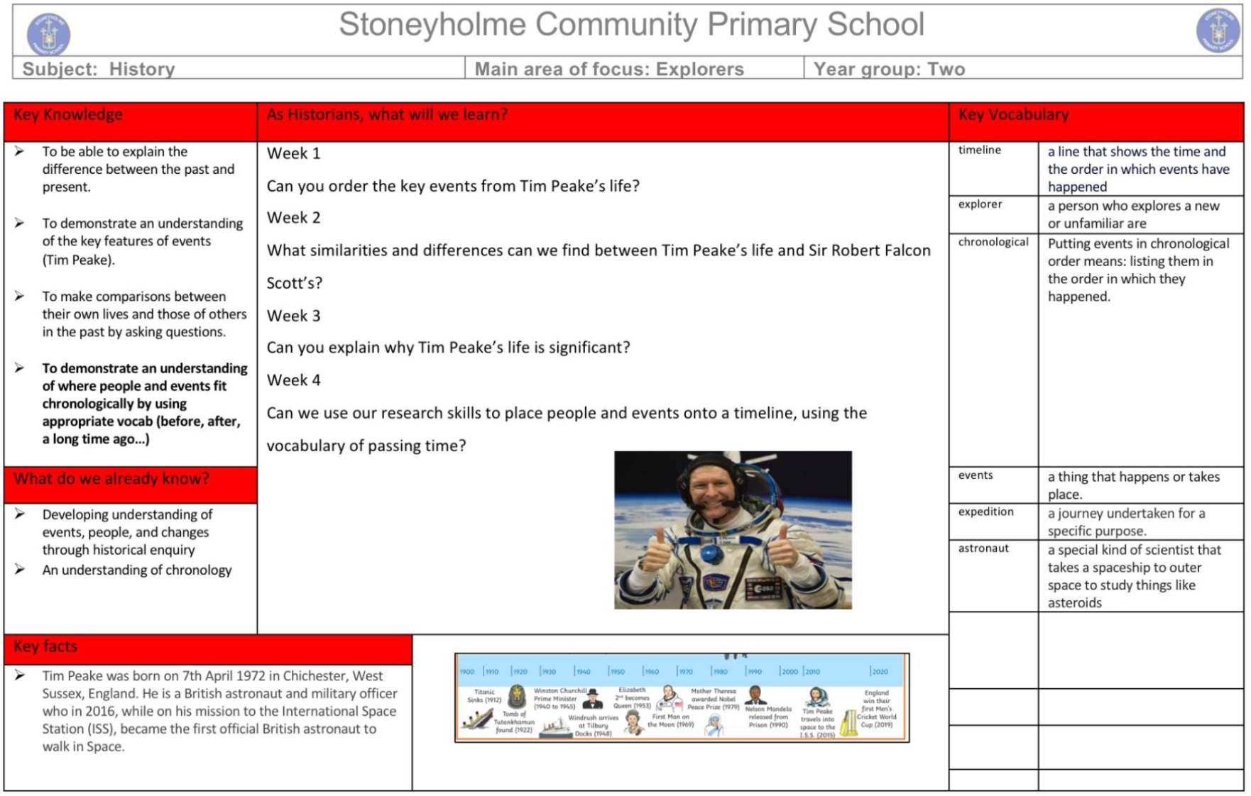 This half term in History, children will continue learning on explorers, with a focus on Tim Peake and his remarkable journey into space. They will explore the key events in his life, compare his achievements with those of Sir Robert Falcon Scott, and discuss why Tim Peake is an important figure today. Children will also develop their understanding of timelines, learning how to place events in chronological order using vocabulary linked to the passing of time. This topic helps children build their enquiry skills while discovering the exciting world of exploration, past and present.