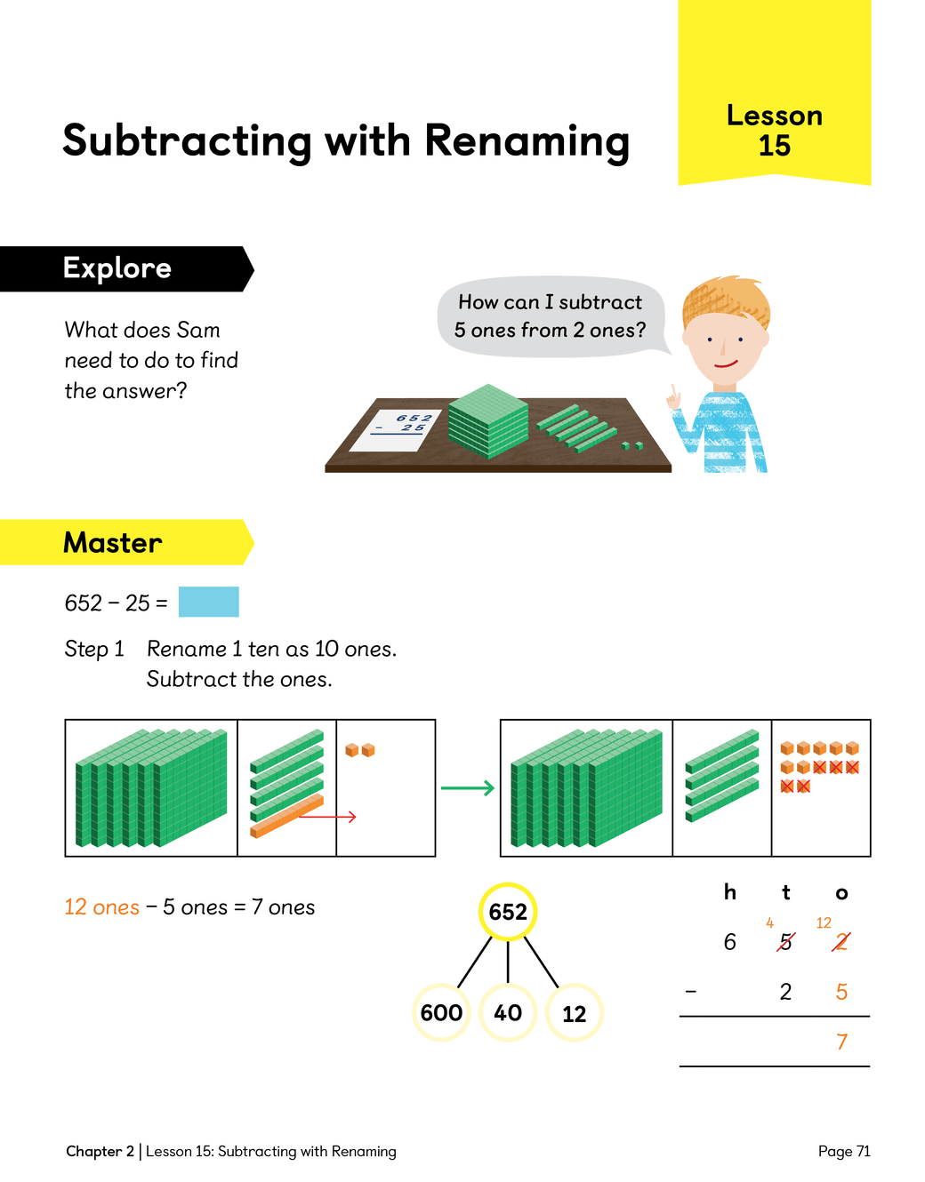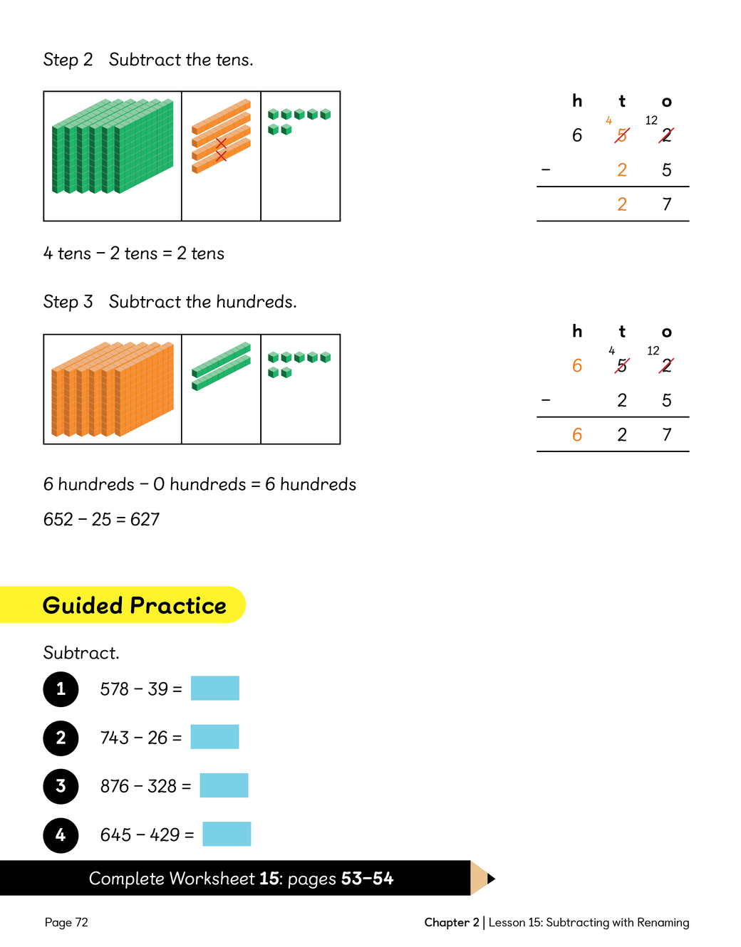 LC: To be able to subtract from a 3-digit number with the renaming of 1 ten into 10 ones.