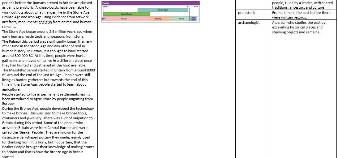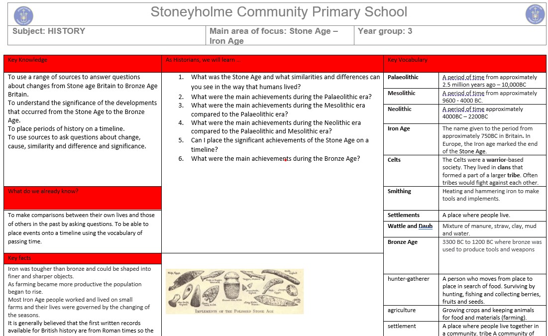 As Historians, we will be travelling back in time to the Stone Age. Pupils will be exploring the similarities and differences in the way that people lived. Pupils will be able to create a timeline of events from the Stone Age to the Bronze Age.