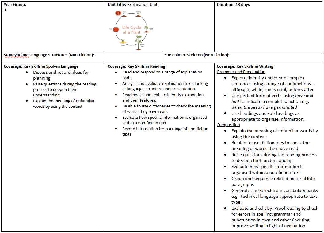 This half term pupils will be exploring the key features of a non-fiction explanation text based on the lifecycle of a flowering plant. Pupils will be able to write their own explanation text by writing about the cause and effect. Pupils will understand the use of use of headings and subheadings and how to implement these using complex sentences in to their writing piece.