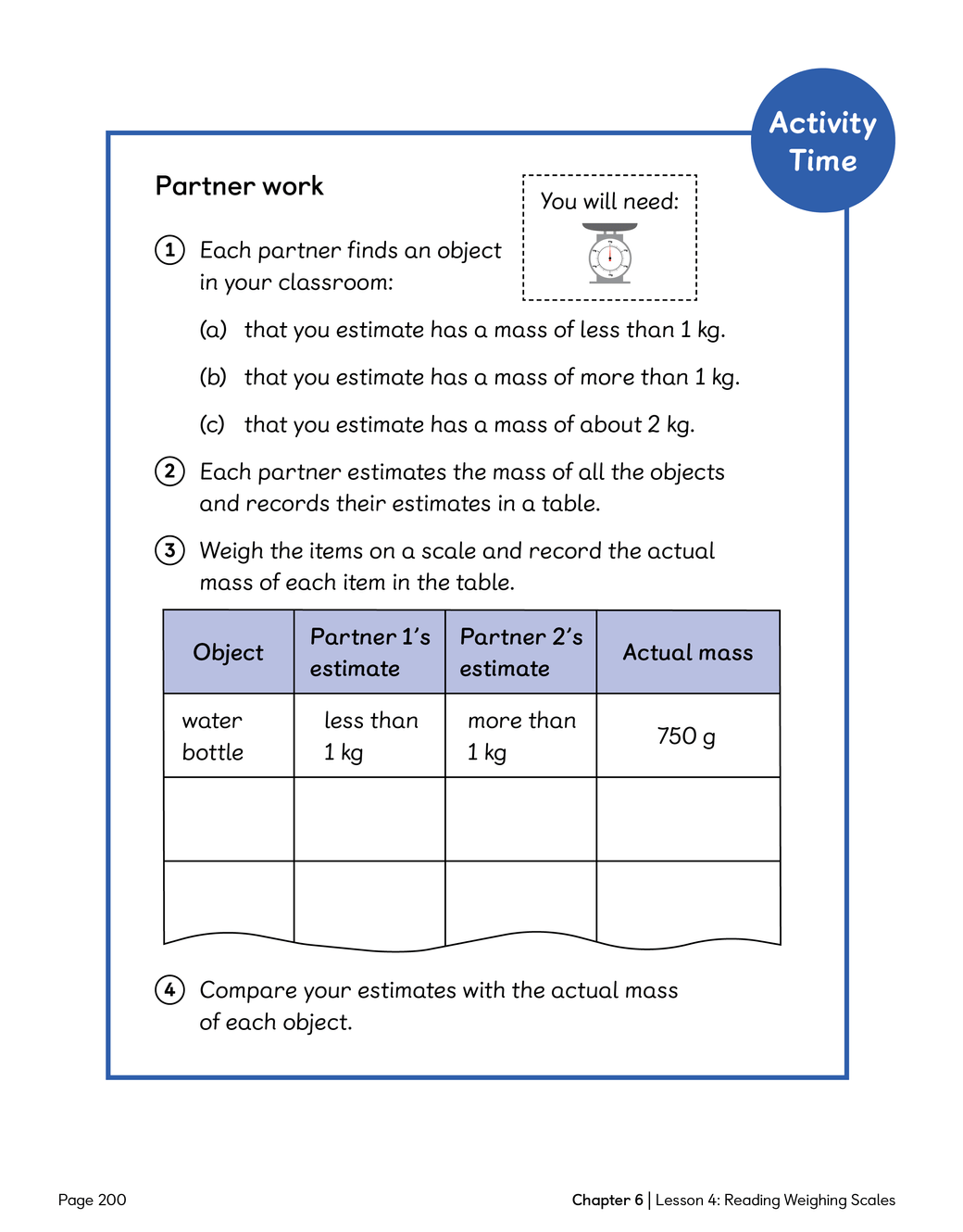 LC: To be able to read weighing scales to determine mass in kilograms.