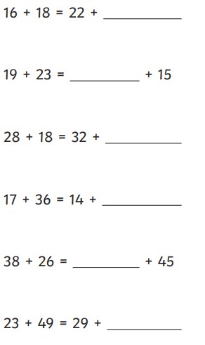Make the equations balance by putting in the missing number. Both sides of the = sign must have the same value.