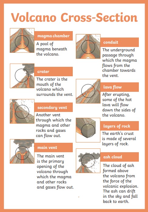 LC: To name the key parts of a volcano and explain them.