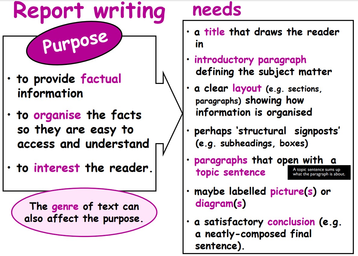 heading, text boxes, sub-headings, contents, bullet points, glossary, diagrams, first paragraph that tells us what the report is about information organised in paragraphs, closing sentence that rounds off the report .