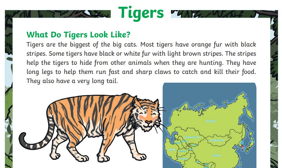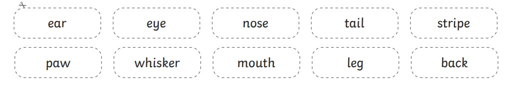 Read the the information about what tigers look like with the teacher. Use what you have read to write the labels on the picture.