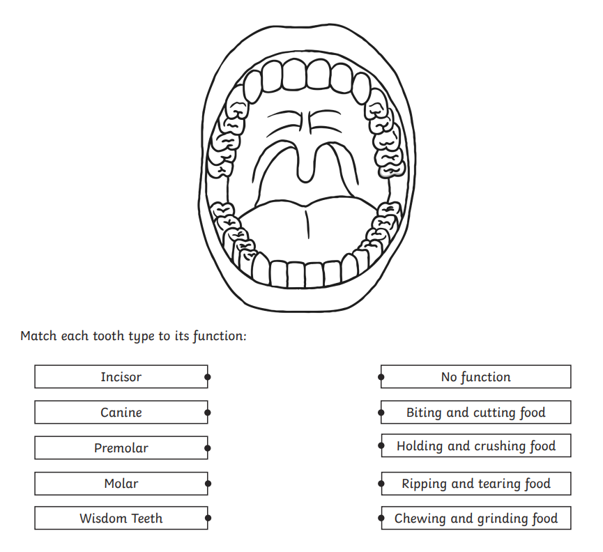 Interesting fact: When you have your teeth checked by a dentist, you may have heard them say lots of letters and numbers. The numbers refer to your adult teeth and the letters to your milk teeth. Letters and numbers start from the back of your mouth and go to the front. So a wisdom tooth would be eight, the incisor on that side would be one. As children have fewer molars and premolars and no wisdom teeth, milk teeth are labelled from the back E D C B A. So the back molar would be E and the incisor on that side would be A.