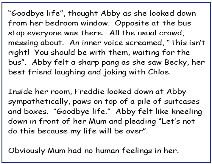 Opposite, at the bus stop, everyone was there. All the usual crowd messing about. Abby felt a sharp pang as she saw Becky, her best friend, laughing and joking with Cloe.