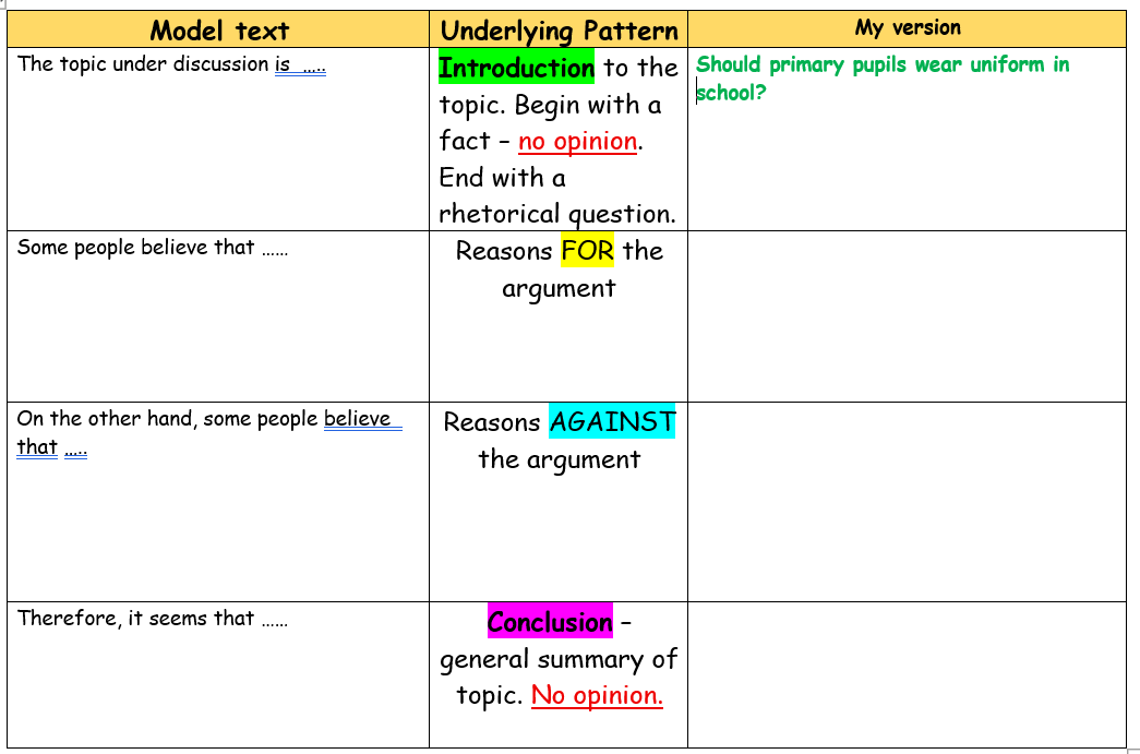 Using the ideas from yesterday's discussion, complete the table with 3 ideas for and 3 ideas against the topic.