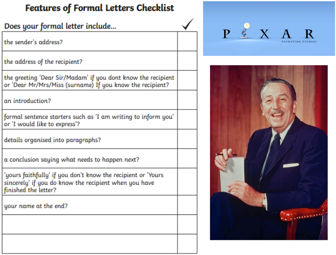Using the job specification and the example letter to guide you, write a letter of application as Walt Disney applying for the post at Pixar.