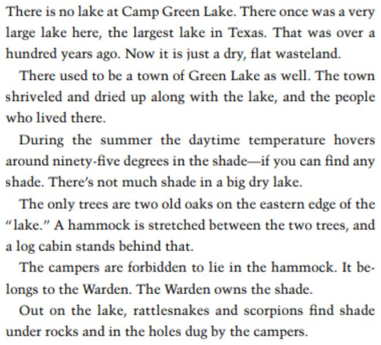 C - Why does the author describe Camp Green Lake as a “dry, flat wasteland”? What effect does this choice of words have on the reader?